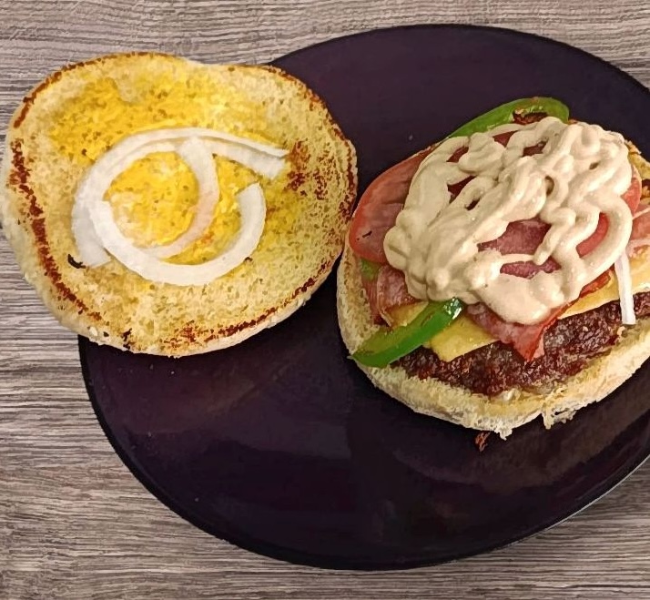 Quesos, cebolla caramelo, pepinillos y aderezo de la casa